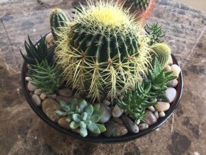 “We planted a small golden barrel cactus near our front steps. Ten years later it is still there barely bigger but far more meaningful.”