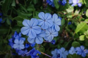 Plumbago adds a calm, cooling touch with its soft blue flowers that appear year-round. It’s hardy, fast-growing, and needs only occasional pruning to look neat.